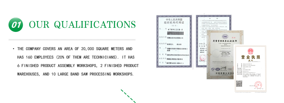 The company is located in the beautiful Wucheng Huaqiao Industrial Park in Jiangcheng, adjacent to Huangshan Mountain, a famous scenic tourist area in the south of Anhui. The forest resources are very rich, and the water and land transportation is very convenient. The Wutai Canal, Wuyan Expressway, and Wuxuan Expressway pass by. The logistics center in southern Anhui is built here. The company covers an area of 20,000 square meters and has 160 employees (20% of them are technicians). It has 6 finished product assembly workshops, 2 finished product warehouses, and 10 large band saw processing workshops outside the jurisdiction; drying rooms, h... ...